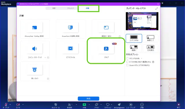 2025年10月22日のアップデートで、Zoomクリップで作成した動画を画面共有することができるようになりました。