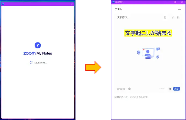 「自分用メモ」のウィンドウが開くと、自動で文字起こしがスタートします。