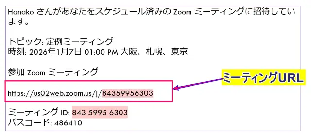 その時のために、ミーティングIDとパスコードの情報も一緒に送るようにしましょう。